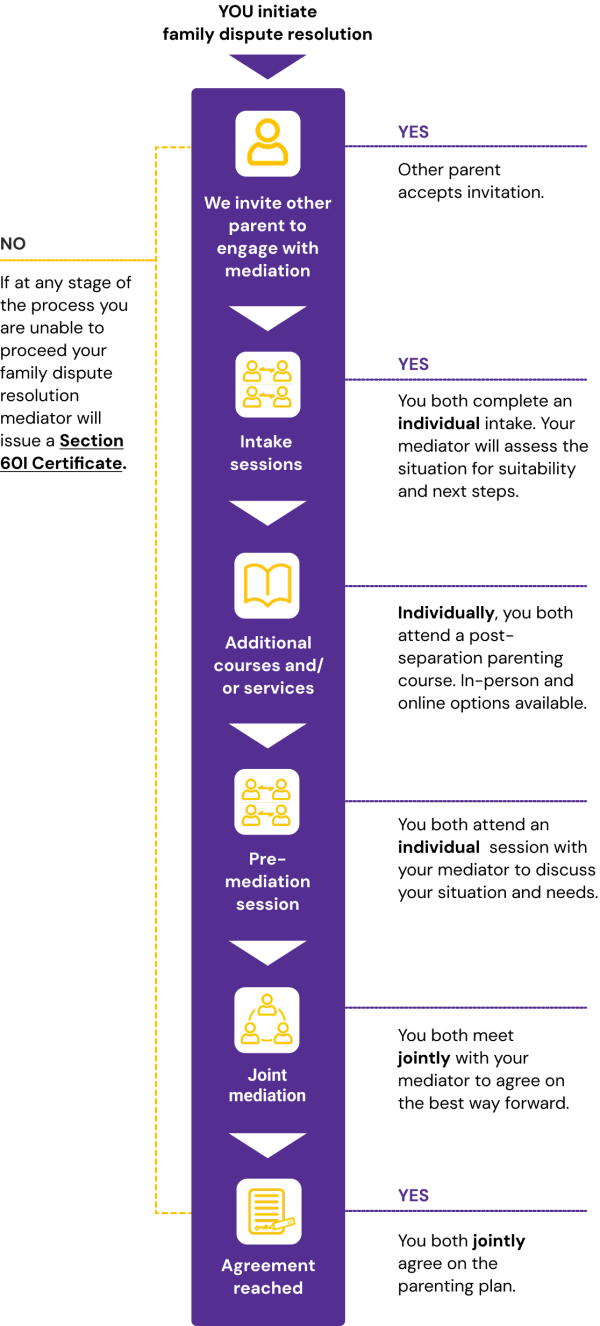 Family Dispute Resolution is a specialised form of mediation designed to assist families in resolving disputes around parenting arrangements after separation. This approach prioritises the best outcome for the child and their future whilst supporting family members to resolve conflict and reach an agreement.
